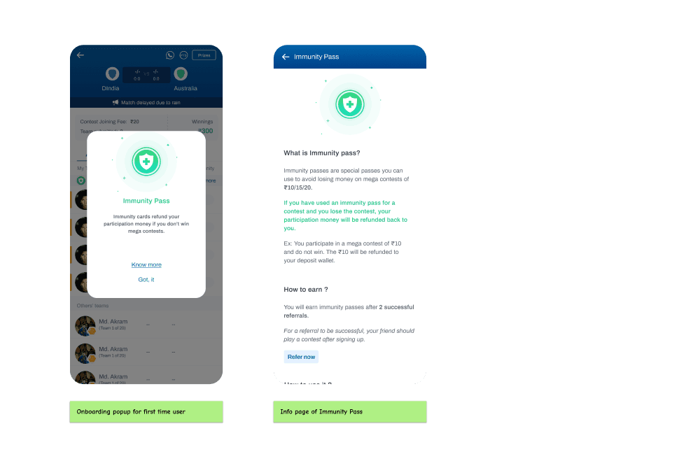 Designed intuitive entry points for discovering immunity cards within the team creation and contest entry flows.