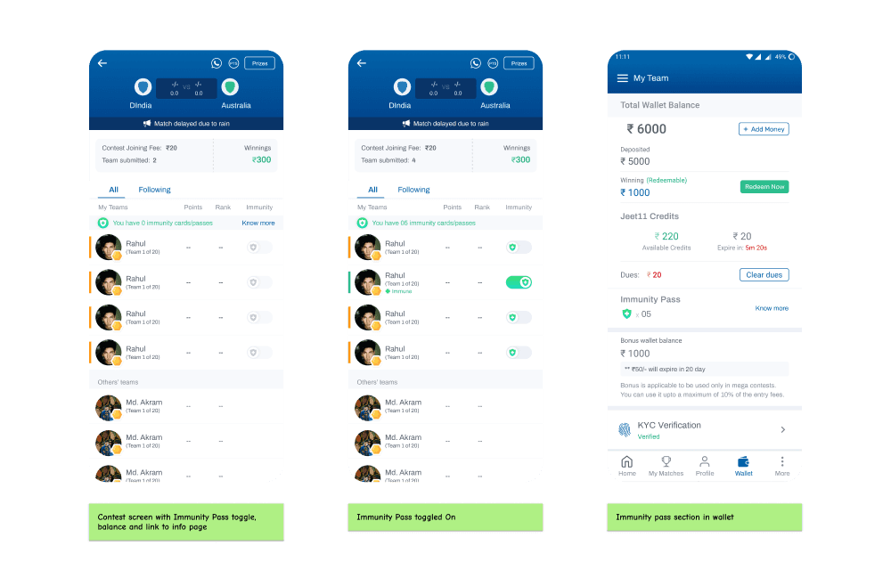 The main challenge was to design a new layer on top of the existing fantasy sports participation without disrupting the user flow. The immunity card needed to be easy to discover, apply, and remove, with clear availability to assist user decision-making.
