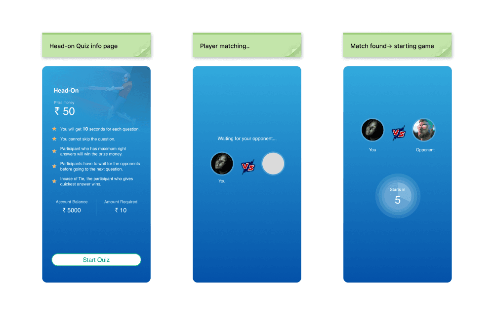 For head-on contests, users must wait for a match to be found after paying the entry fee. Once matched, both players proceed to the quiz.