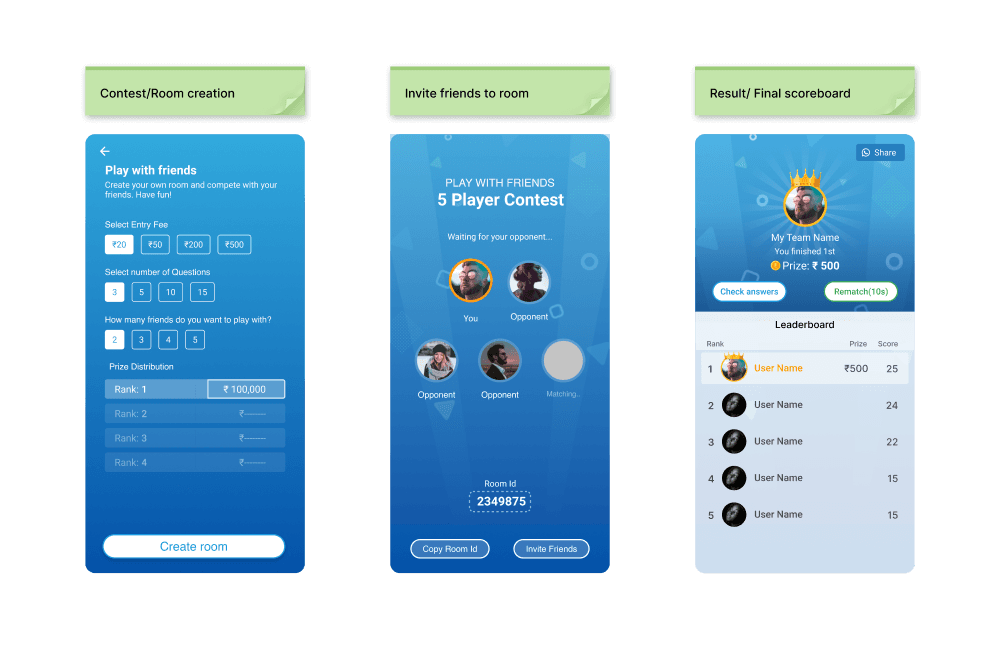 After paying the entry fee, the contest creator can invite friends via social media or by sharing the room ID. Once all participants join, the game starts automatically.
