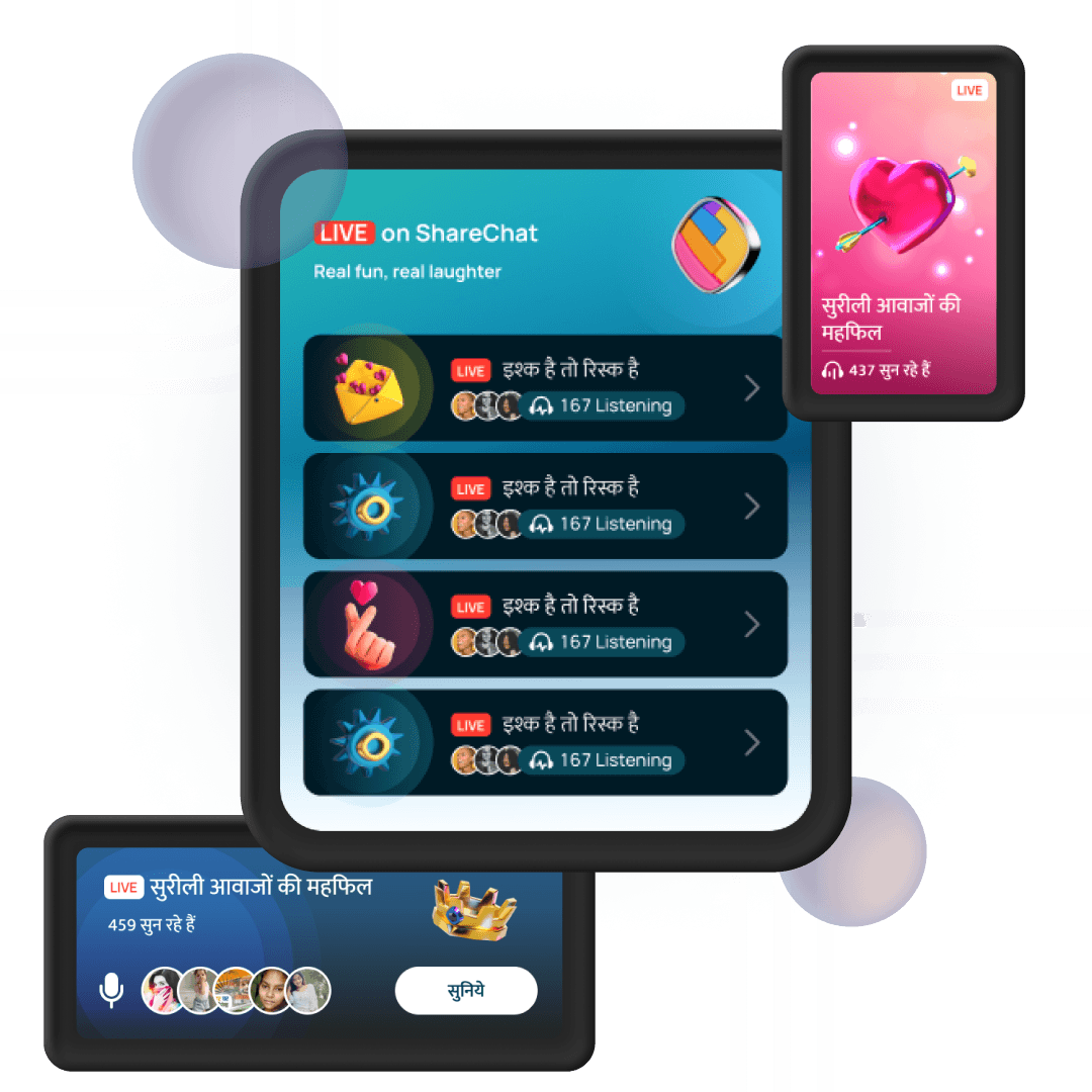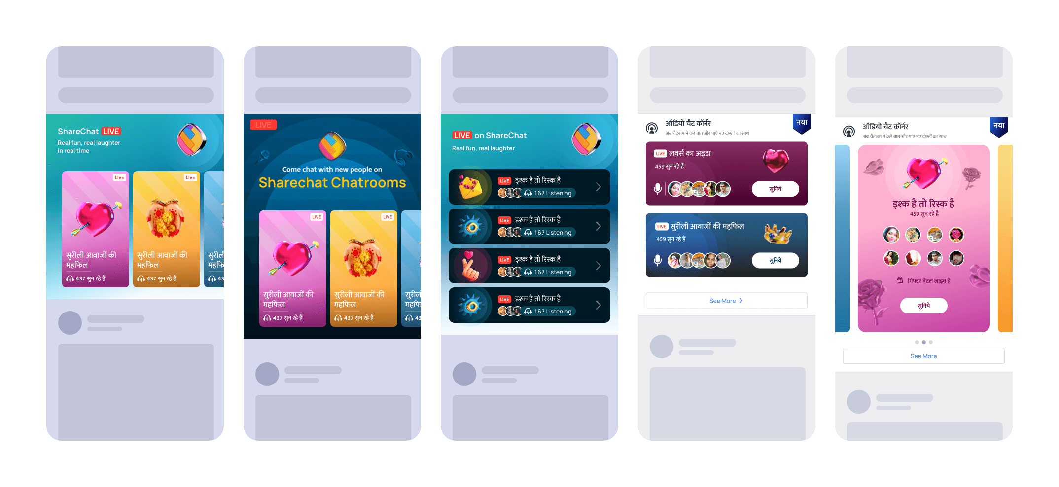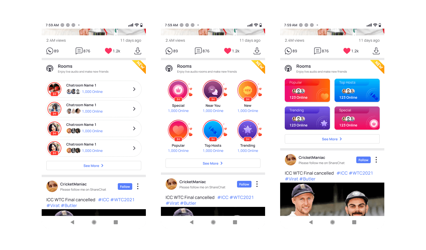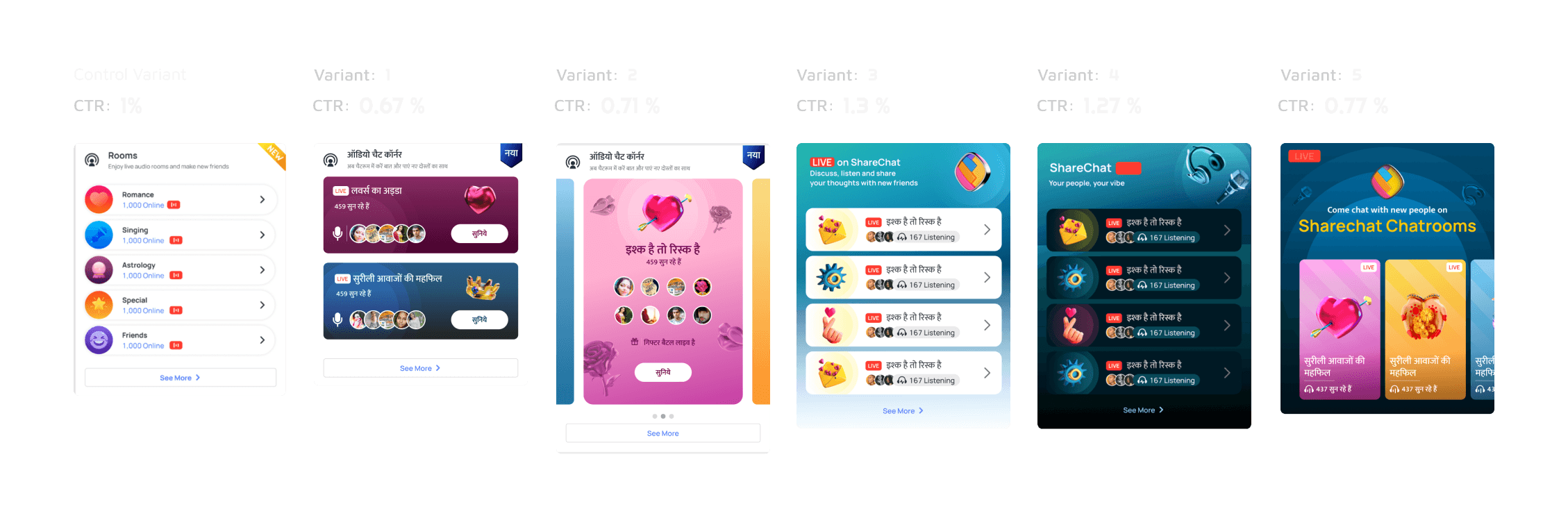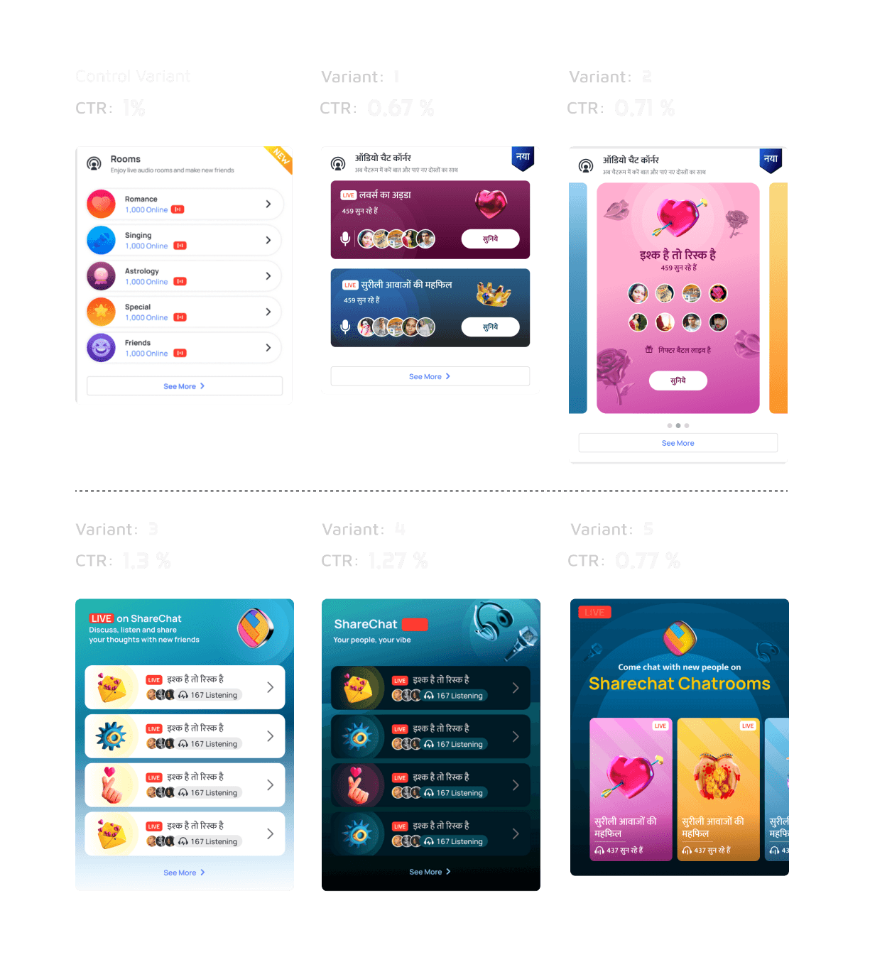 Experimented with different card styles, such as using a “Live” tag and a headphone icon alongside the listening count, to visually emphasize that these were live audio chatrooms.